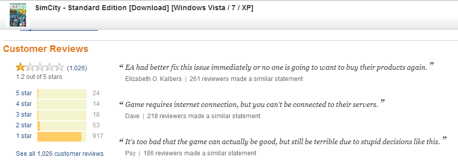 - Following 800 poor reviews, Amazon stops selling download copies of SimCity (geek.com)