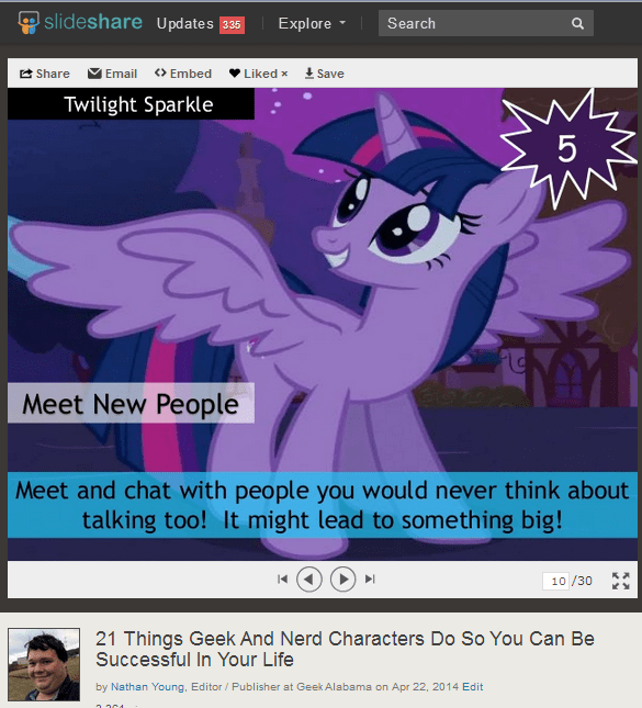 I also wanted to show off one of latest SlideShare presentations called 21 Things Geek And Nerd Characters Do So You Can Be Successful In Your Life. It includes 21 very popular geeky/nerdy characters and some life lessons, and I have included Twilight Sparkle as number 5. I think the lesson of meeting new people makes sense, enjoy!